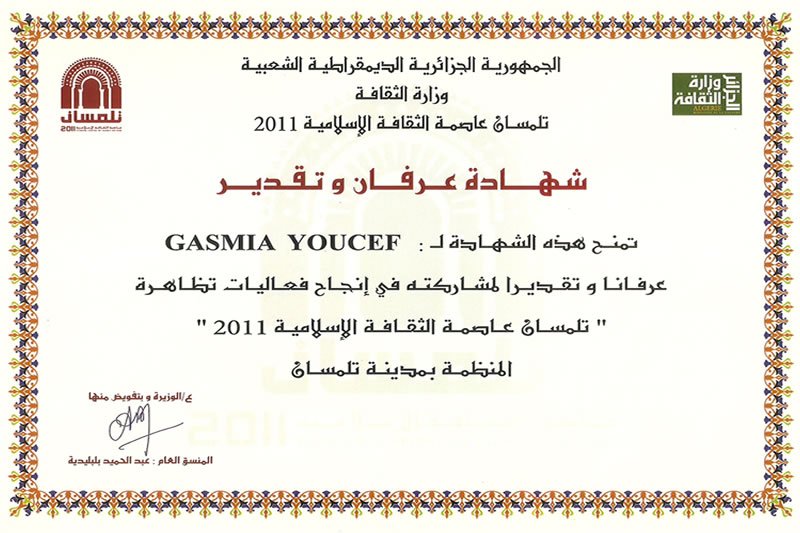 - Suite au bon déroulement des travaux et au bon suivi des travaux de climatisation au niveau du Palais de la Culture et du Pavillon des expositions à la Wilaya de Tlemcen durant l’année culturelle ayant pour thème « Tlemcen, Capitale de la Culture Islamique », La société GESCO a eu le privilège de recevoir un titre honorable de la part de la Ministre de la Culture « Madame Khalida Toumi » avec ses félicitations et ses remerciements.